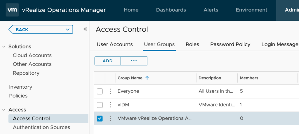 vRealize Operations Administration > Access > Access Control > User Groups