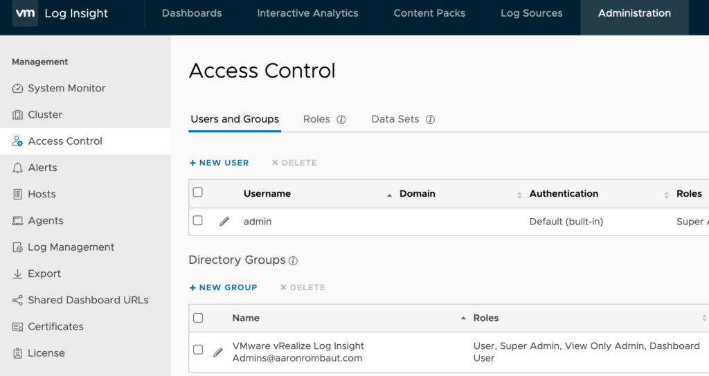 vRealize Log Insight Administration > Management > Access Control > Directory Groups