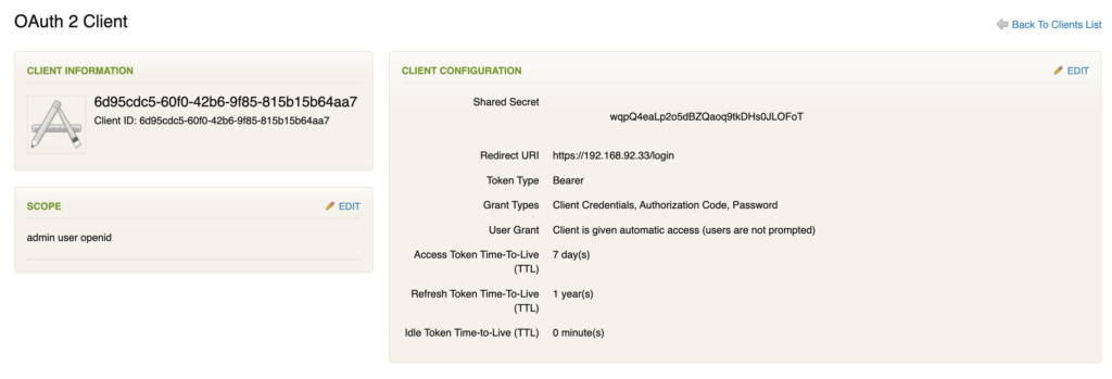 Verify the Redirect URI matches the IP address or fully qualified domain name of the vRealize Log Insight Appliance. If this is the case, copy the Client ID. If not, click Back To Clients List and continue clicking on Client ID entries until you find the correct client configuration.
