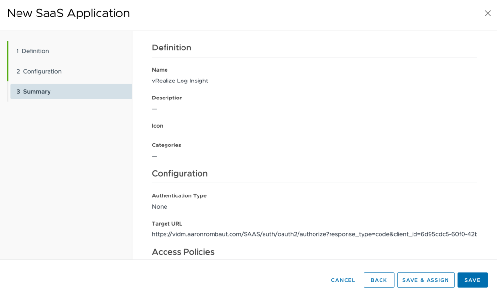 Test this out by copying and pasting the configured target url in a new browser window. If successful, you should be redirected to Workspace ONE Access if you are not currently logged in or just taken directly to the vRealize Log Insight appliance.