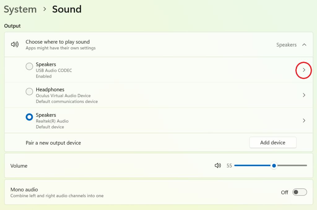 Select the greater than symbol to open the Properties of the audio device intended to use for your radio and software. In my example, it is the USB Audio CODEC.
