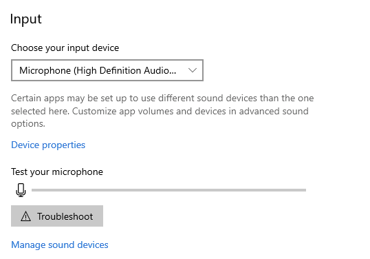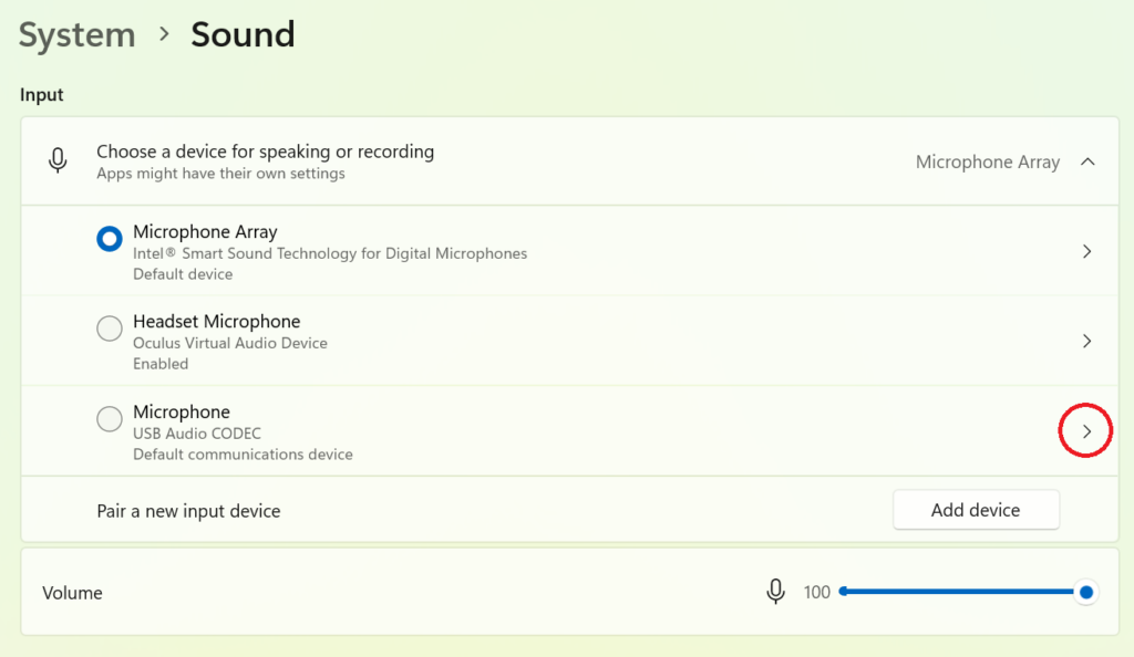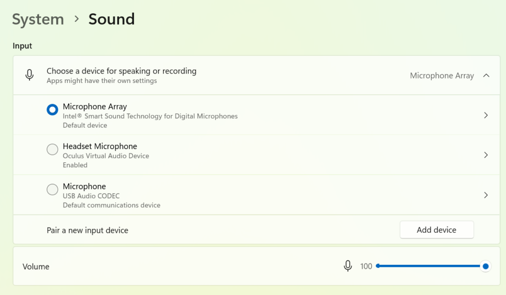 Notice I have two listings for Microphone Array in the example. One is the USB Audio CODEC and the other is Intel(R) Smart Sound Technology for Digital Microphones. As you can see, I have selected the Intel(R) Smart Sound Technology for Digital Microphones as the default Input device on my computer. I have also configured the Volume to 100%.