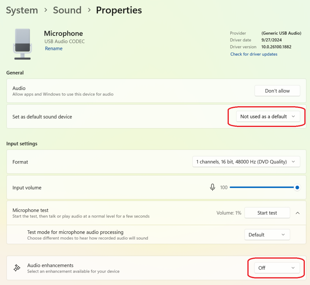 Notice the Set as default sound device is set to Not used as a default. (If this setting is not visible, go back to the other Input device, select the Properties and configure the Set as default sound device as Use as default for communications.)
