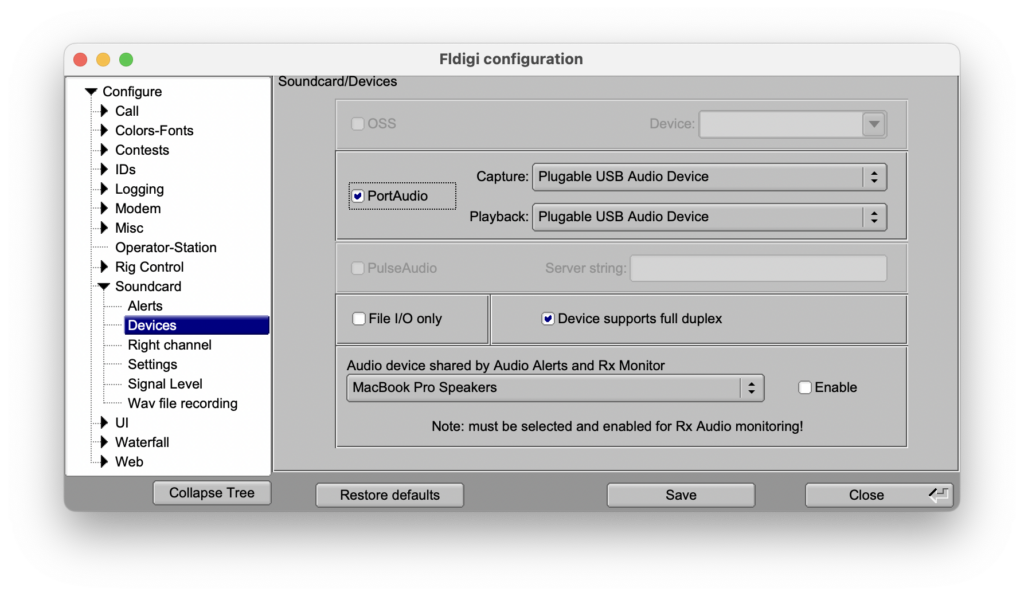 I am using an Apple M1 Pro. On the Fldigi configuration window, expand Soundcard, select Devices, select PortAudio, and select the appropriate Capture (input) and Playback (output) devices.