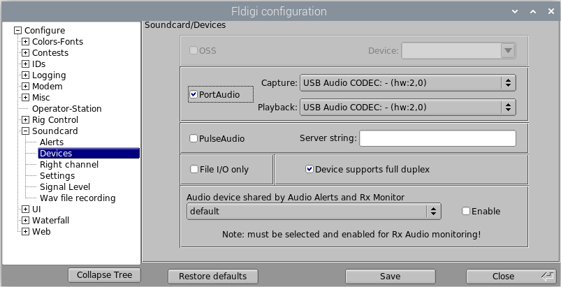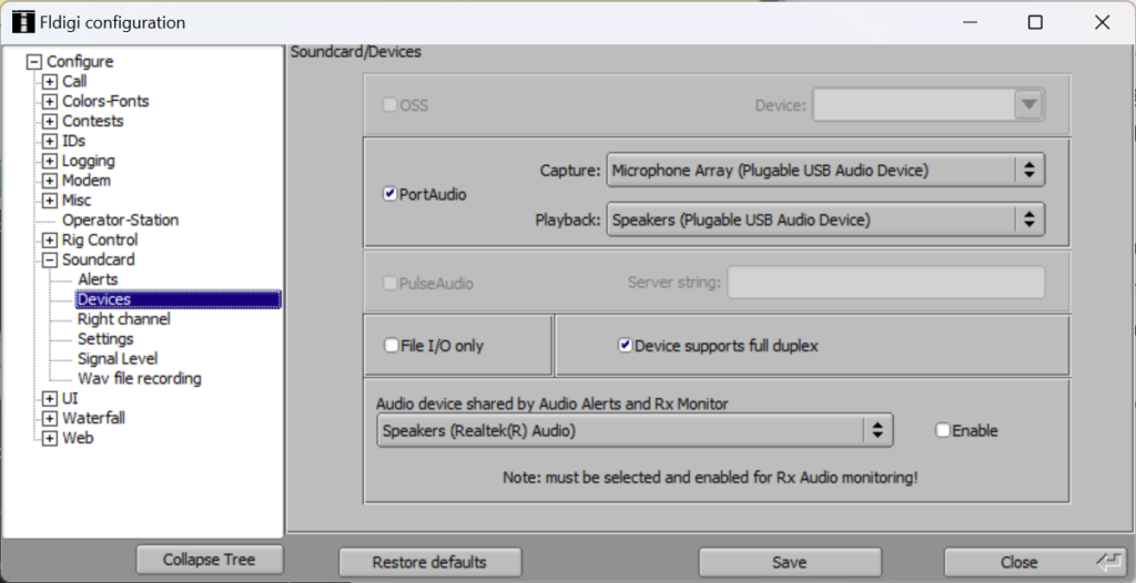 On the Fldigi configuration window, expand Soundcard, select Devices, select PortAudio, and select the appropriate Capture (input) and Playback (output) devices.