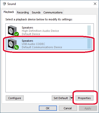 Here we can see the Output tab is selected for USB Audio CODEC 1.