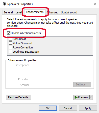 Select the Enhancements tab and select Disable all enhancements.