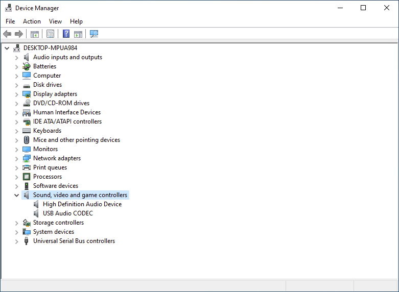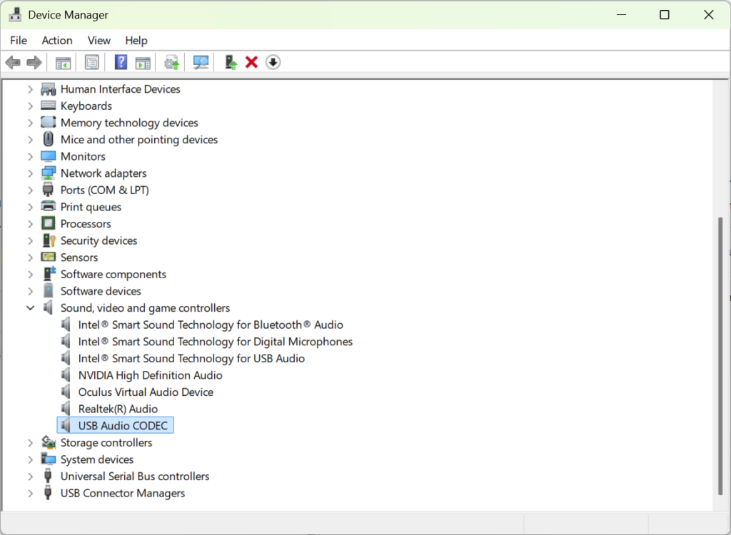 Open Device Manager (devmgmt.msc) and expand Sound, video and game controllers. Verify the audio devices you are expecting to use show up here. This indicates that Windows recognizes your audio devices as a usable sound controller. You can see in the screenshot below, the built-in System audio device, High Definition Audio Device, as well as the Radio audio device, the USB Audio CODEC.