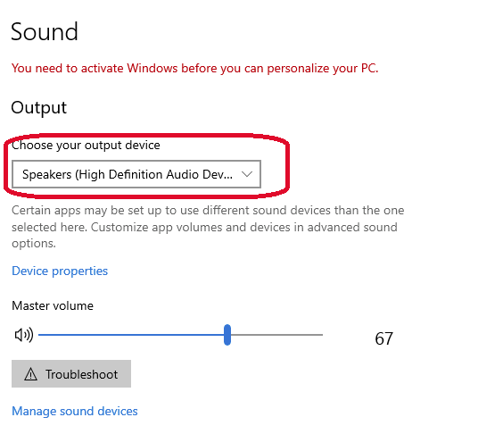 Open Settings > System > Sound. Verify the Output is configured to the device you expect.