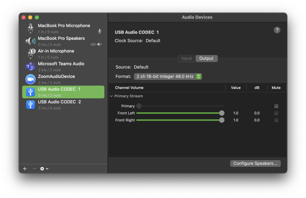 Here we can see the Output tab is selected for USB Audio CODEC 1.