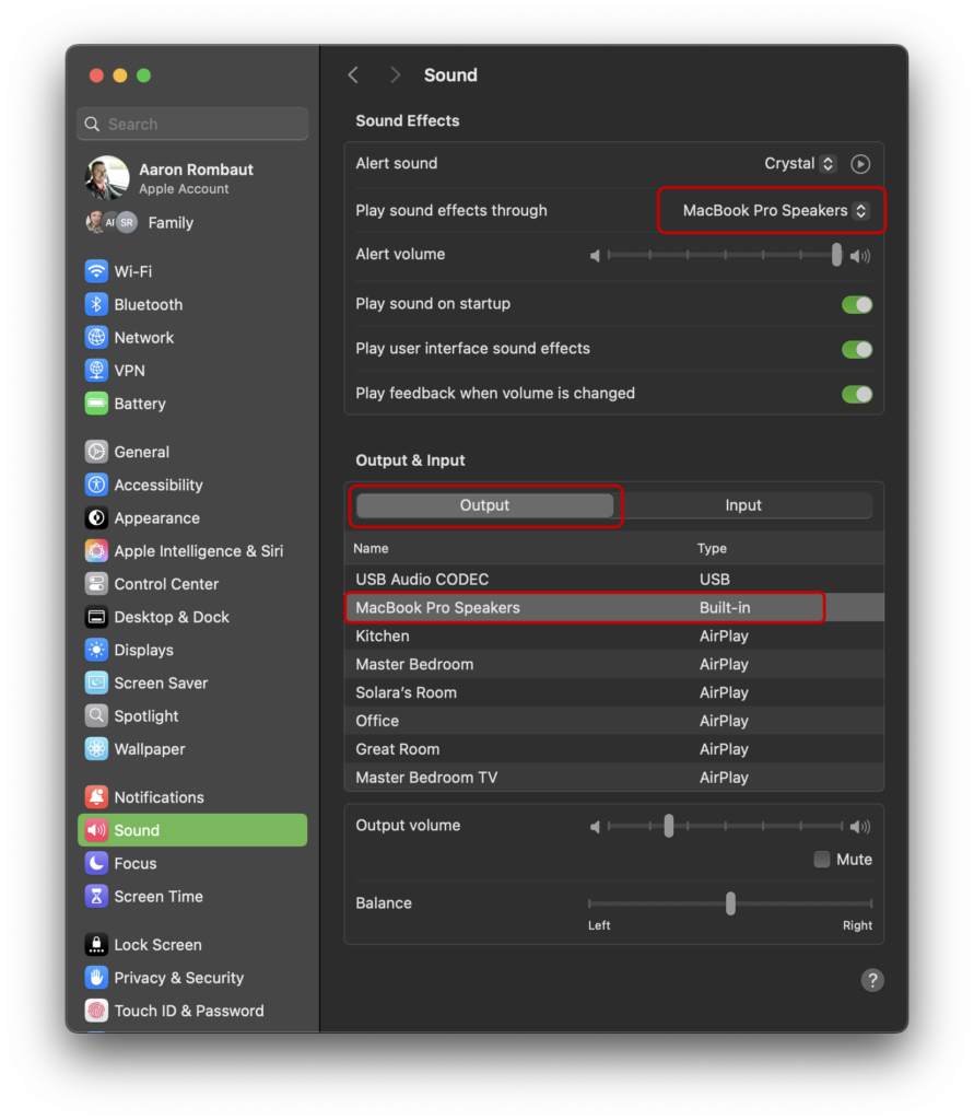 To choose the Output device, open System Settings and select Sound. Make sure the audio device for the radio is not configured in the Sound Effects or Output & Input sections. Choose the Output tab in the lower portion of the window and verify the configured output audio device.
