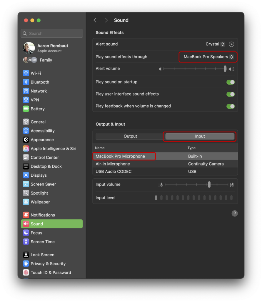 Open System > Sound. Verify the Input is configured to the device you expect.