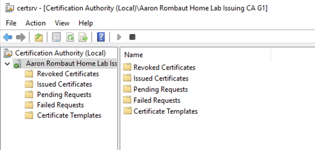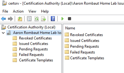 To cut through this, I opened up Active Directory and checked on the account. I saw that the account was not locked. So next, I moved to the Certification Authority to see if there were any Pending Requests or Issued Certificates. This would at least let me know if the workflow even got that far or if there is an issue with handing back the certificate. What I found instead was the service wasn’t even running.