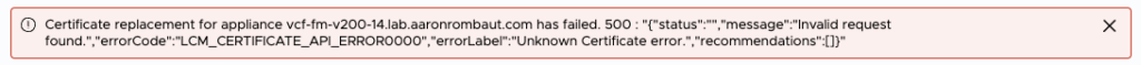 Certificate replacement for appliance vcf-fm-v200-14.lab.aaronrombaut.com has failed. 500 : "{"status":"","message":"Invalid request found.","errorCode":"LCM_CERTIFICATE_API_ERROR0000","errorLabel":"Unknown Certificate error.","recommendations":[]}"
