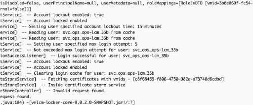 The log location here is /var/log/vrlcm/vmware_vrlcm.log on the VCF Operations Fleet Management appliance. You can see here that I supposedly have a locked account. The wording is quite confusing, I will admit, but the gist is that it is reporting that the account is locked.