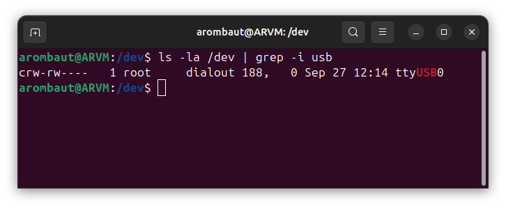 crw-rw---- 1 root dialout 188, 0 Sep 27 12:14 ttyUSB0