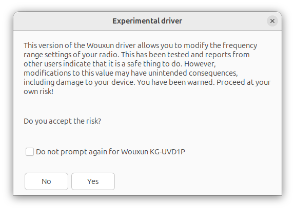 When I select that model, I receive another pop-up letting me know the driver is experimental. This is just a precautionary statement, but know that if your programming does something you aren’t expecting or doesn’t work at all, this may be the reason. In this case, I am going to select Yes. Optionally, if this is a radio you program often and do not experience trouble with, it may be safe to select the Do not prompt again for … message.