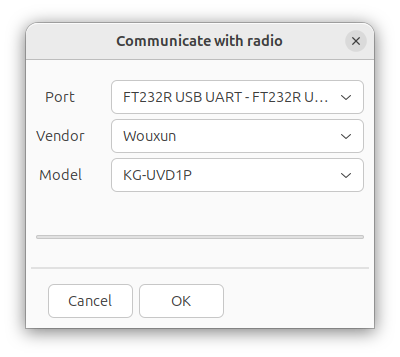 From the Communicate with radio window, select the Port, choosing the appropriate port for your configuration. Select the Vendor and Model for the radio you intend to use.