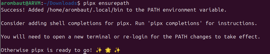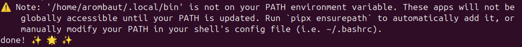 I received a Note regarding the directory not being in my PATH environment variable. Rather than have to remember where it is installed and use an absolute path, I am going to update my PATH environment variable using the pipx option.
