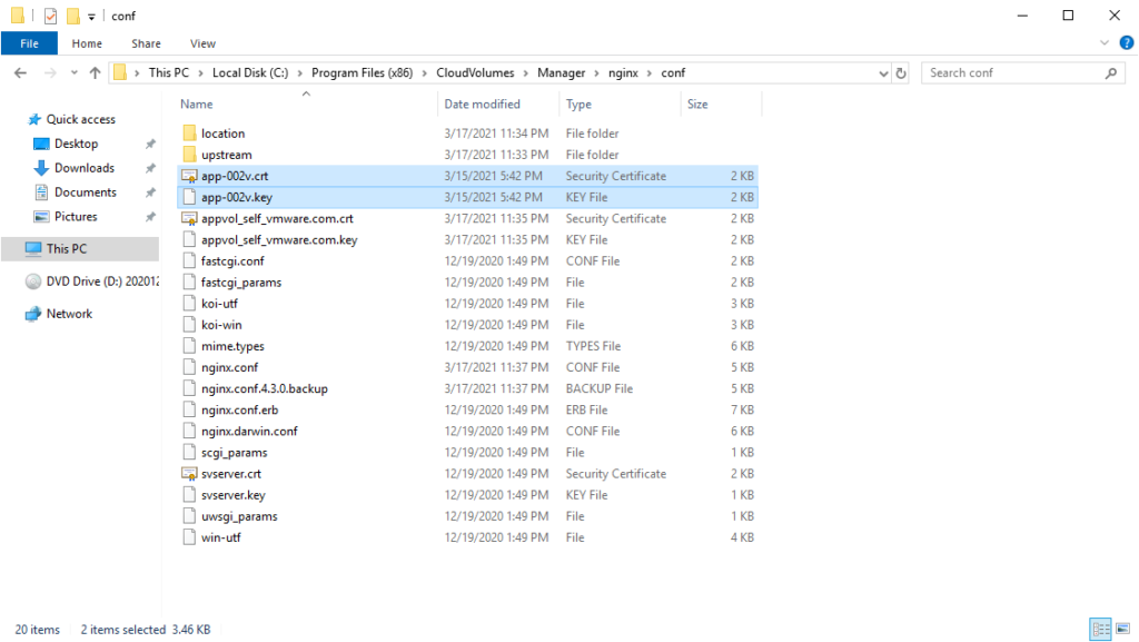 | Web Interface Certificate | <user-defined>.crt | C:\Program Files (x86)\CloudVolumes\Manager\nginx\conf |