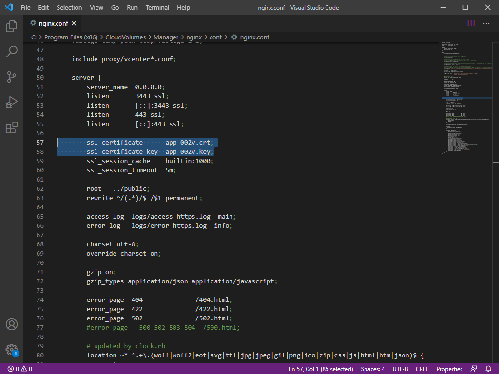 Edit lines 57 (ssl_certificate) and 58 (ssl_certificate_key) to reflect the names of the uploaded certificate and key.