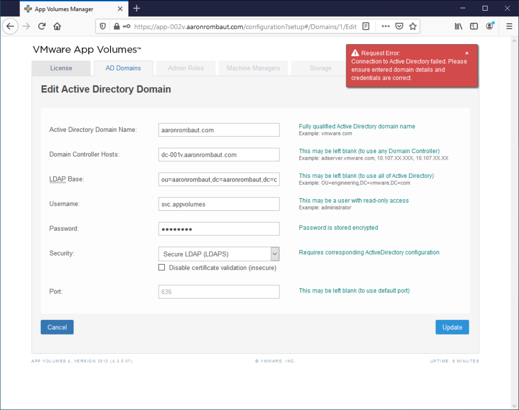 The intermediate and root certificates that signed the Active Directory Domain Controller certificate are necessary to use Secure LDAP (LDAPS). The order of the certificate chain I found that works is root + intermediate. The certificate chain is named adCA.pem and located at C:\Program Files (x86)\CloudVolumes\Manager\config.