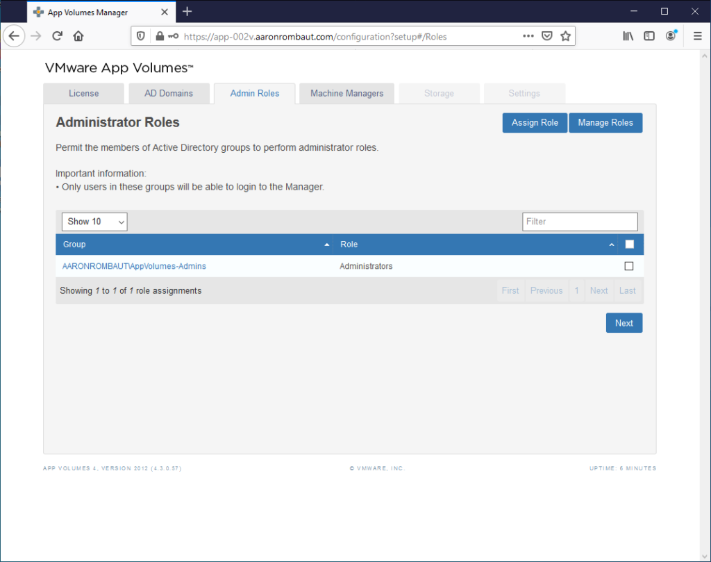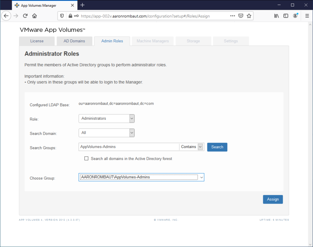Confirm the group you added is assigned the Administrators role. Note: One thing here is that if your administrative users only have Smart Card login, this will not work with App Volumes. A username and password is the only method, right now, to log in. The service account can be used or alternate accounts can be created that use username and password authentication.