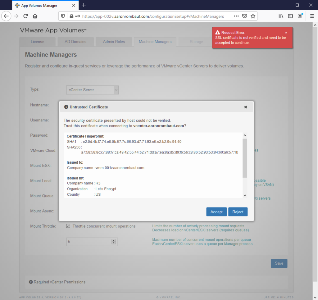 The web interface uses a self-signed certificate installed when the App Volumes Manager is installed initially. This should be replaced with a PEM certificate and key. If planning to use a load balancer, ensure the load balanced fully qualified domain name is set for the Common Name (CN) attribute with each App Volumes Manager’s fully qualified domain name added to the Subject Alternative Name (SAN) attribute of the certificate.