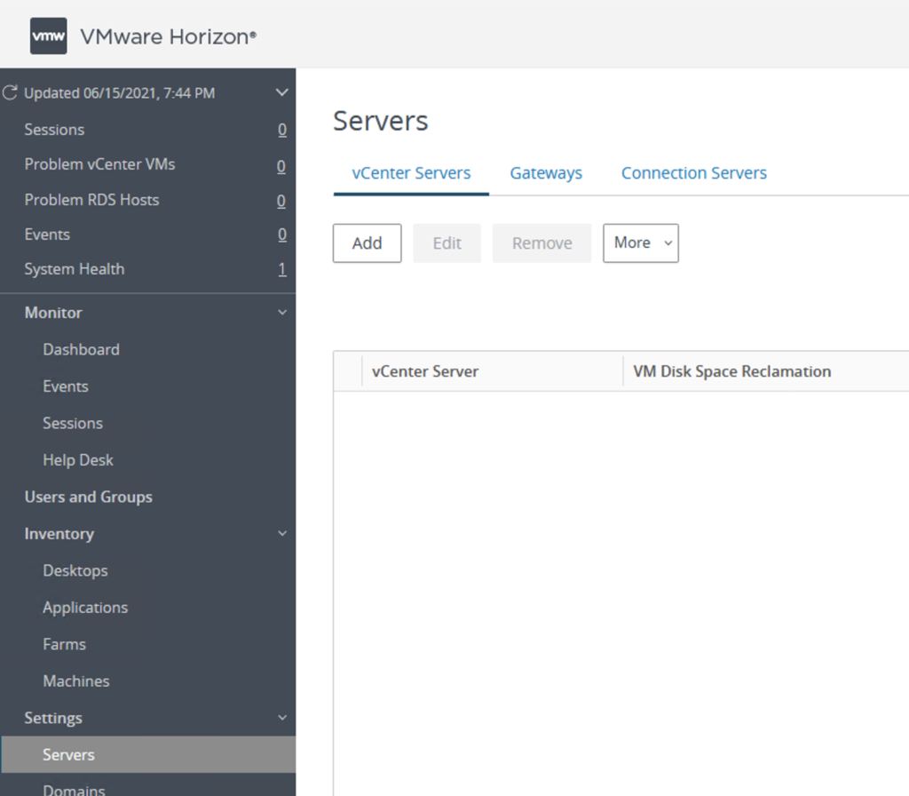 From this menu, vCenter Servers, Gateways, and Connection Servers can be configured.