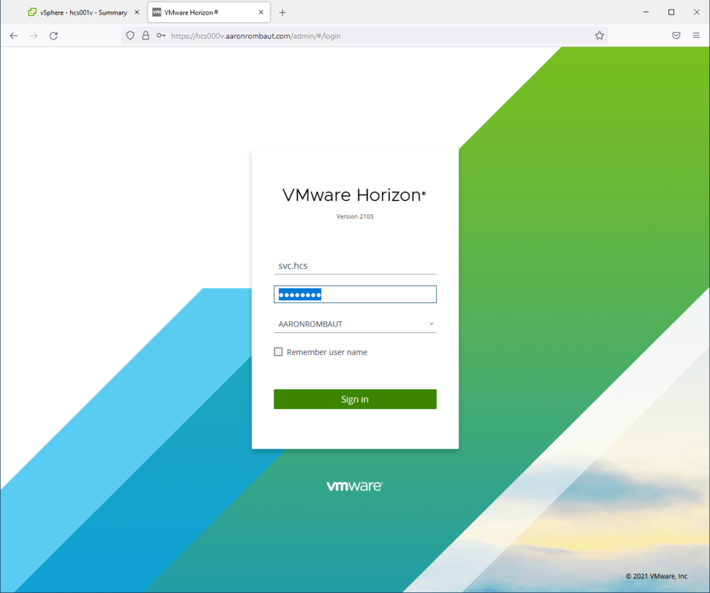 Open a web browser and navigate to the Horizon Console with the fully qualified domain name of the load-balanced address or individual connection server and append /admin to the end. Don’t navigate using the short name, as it will likely result in logon issues when trying to authenticate.