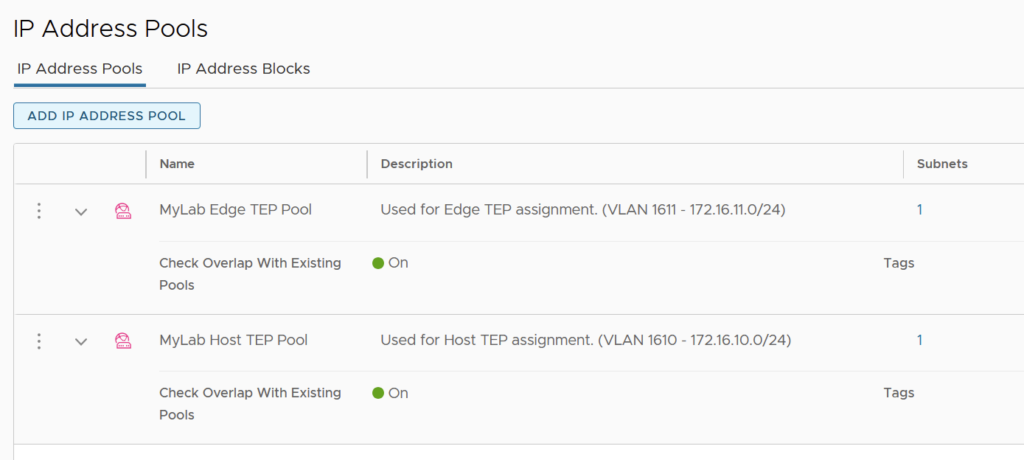 I created two IP Address Pools, one for Host Tunnel Endpoints (TEP) and the other for Edge Transport Node TEPs.
