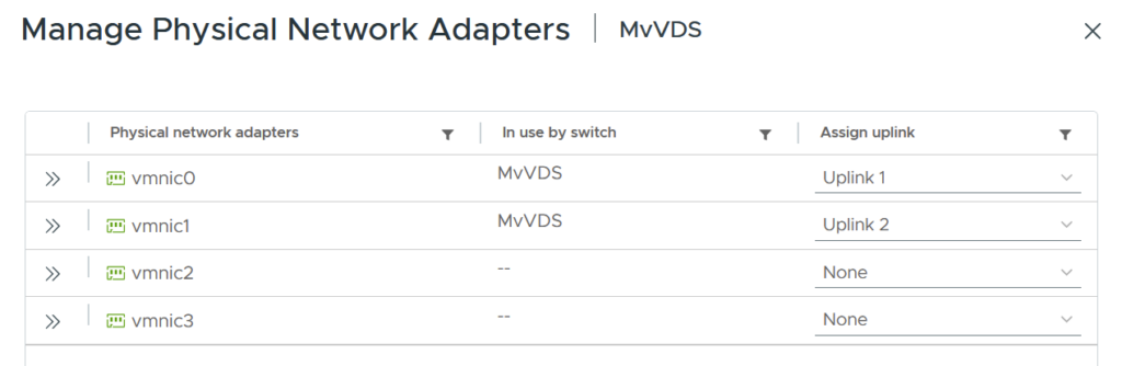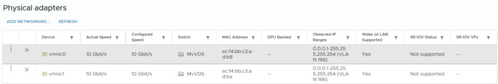 The hosts are both attached to a Distributed Switch with both adapters. vmnic0 and vmnic1 are 10 Gbit/s, the unused adapters are 1 Gbit/s and not used.