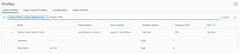 For the Host Uplink Profile, do not configure an MTU in the Uplink Profile. It gets configured on the Distributed Switch in the vSphere Client. Since the Host TEP VLAN is configured to use VLAN 1610, set the Transport VLAN in the Uplink Profile to 1610.