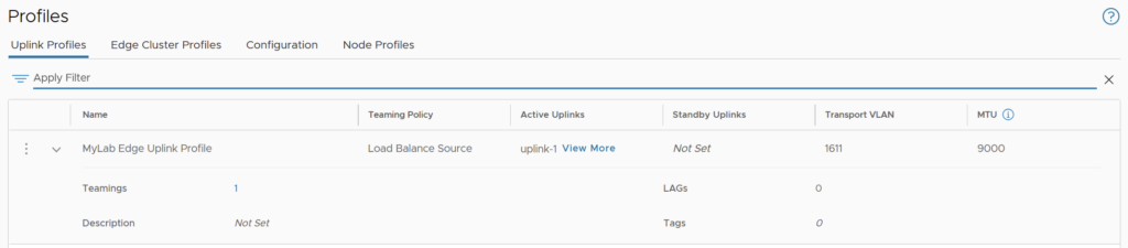 For the Edge Transport Node Uplink Profile, set the Transport VLAN to 1611 for Tunnel Endpoints (TEP) and set the MTU accordingly.