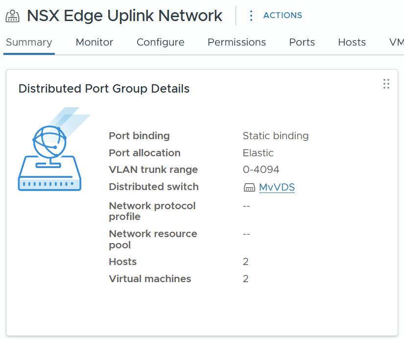 For the Edge Transport Node Uplinks, one or two Distributed Port Groups can be configured. One Distributed Port Group is needed if only using one VLAN transport zone and two Distributed Port Groups are needed if using two VLAN transport zones for redundant uplinks. For this example, only one Distributed Port Group is configured.