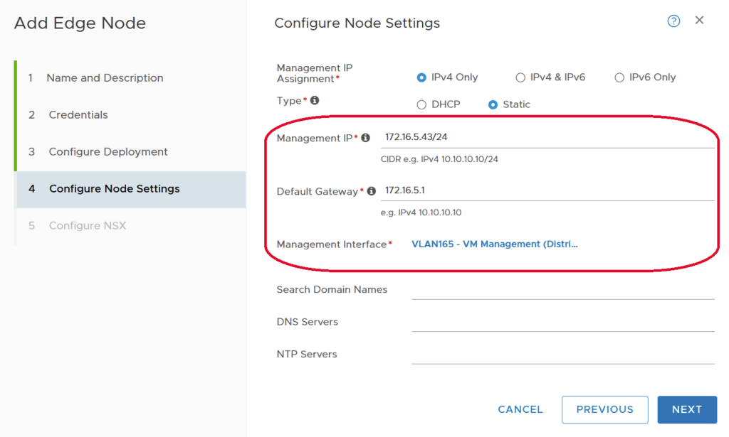 Select an appropriate Management IP Assignment and Type. Provide a Management IP in CIDR notation, Default Gateway, and a Management Interface that corresponds to the Management IP addressing.