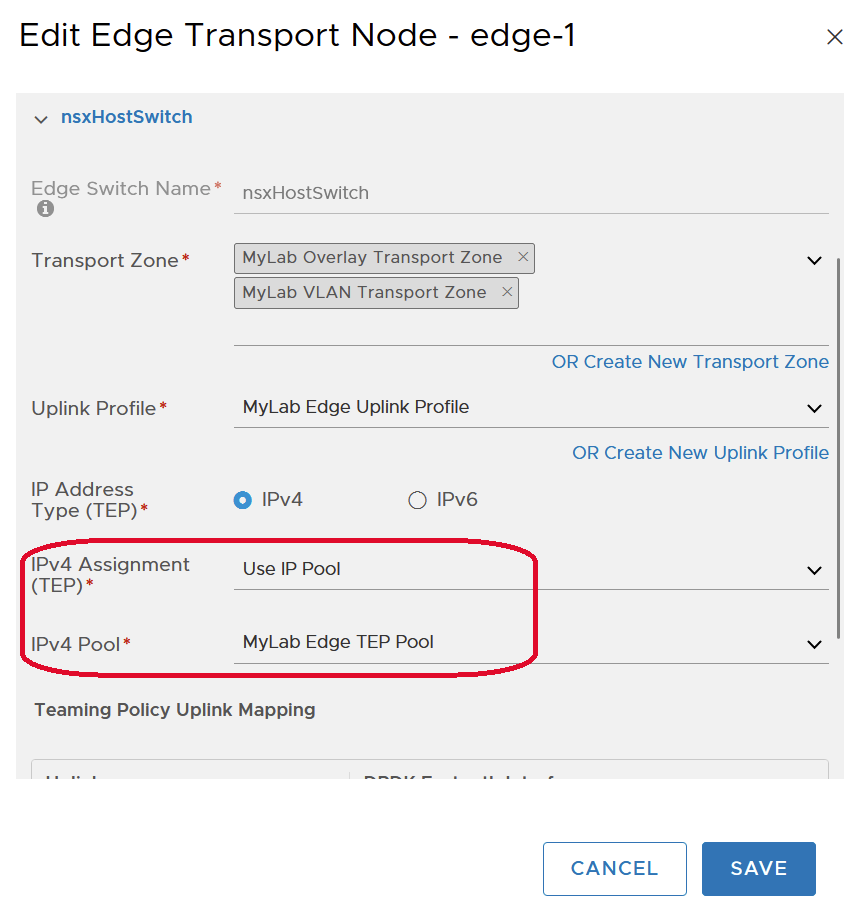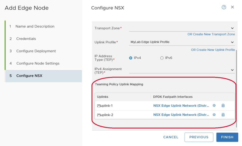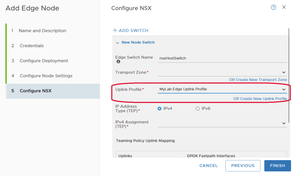 This Uplink Profile is then selected in the Configure NSX step when creating the Edge Transport Node. This is what sets the Teaming Policy Uplink Mapping for the N-VDS switch.