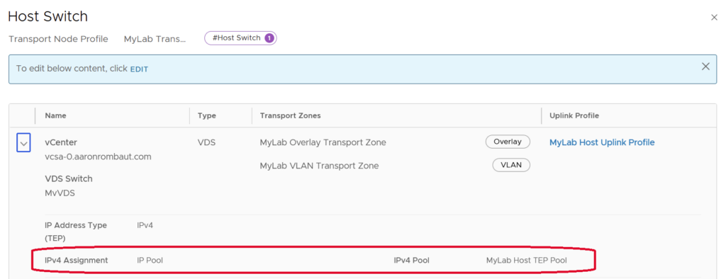 Finally, we have the Edge Transport Node Uplinks. These can also be found in the Configure NSX step when creating the Edge Transport Node. The number of and name of these Uplinks are configured in the selected Uplink Profile.