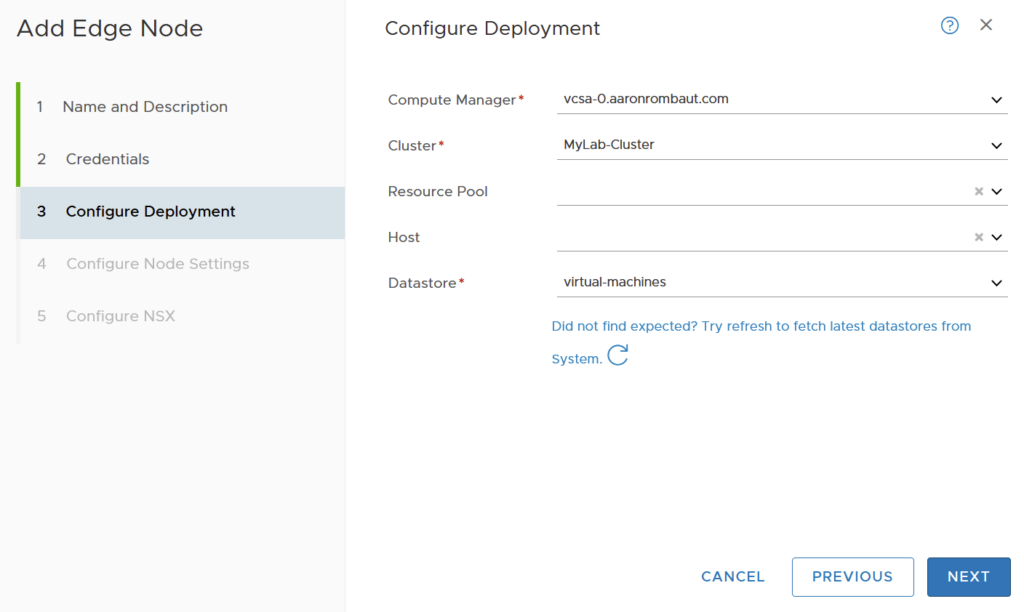 Choose a Compute Manager, Cluster, optional Resource Pool, optional Host, and Datastore.