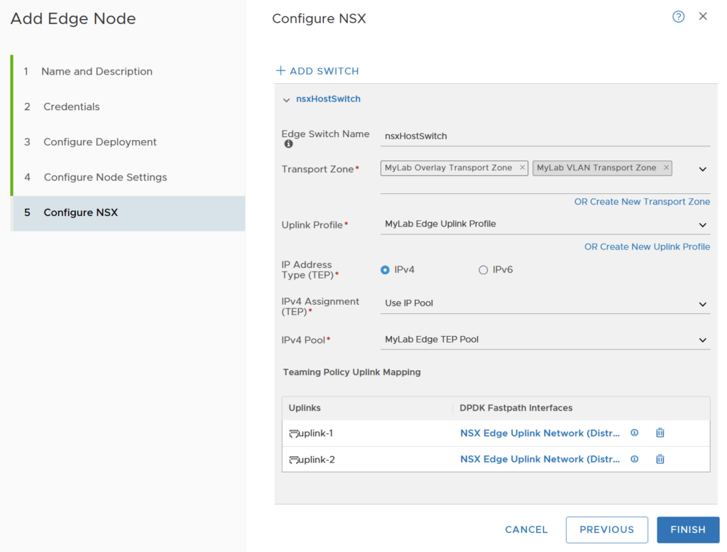 Choose an Edge Switch Name or leave the default. Choose one Transport Zone for Overlay traffic and one or more for VLAN Transport Zones. Choose an appropriate Uplink Profile. Select the IP Address Type (TEP), IPv4 Assignment (TEP), and IPv4 Pool (if using an IP Pool). Finally, for the Teaming Policy Uplink Mapping, select the appropriate Distributed Port Group(s) if using a Distributed Switch with vSphere or the appropriate NSX VLAN Segment(s). The number of uplinks presented directly corresponds to the selected Uplink Profile.