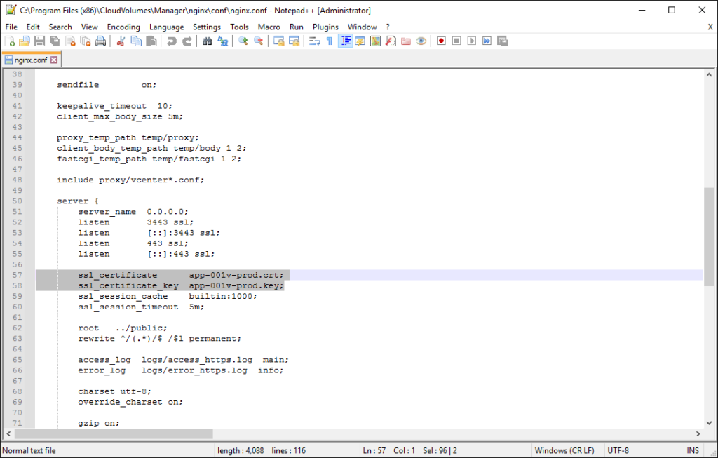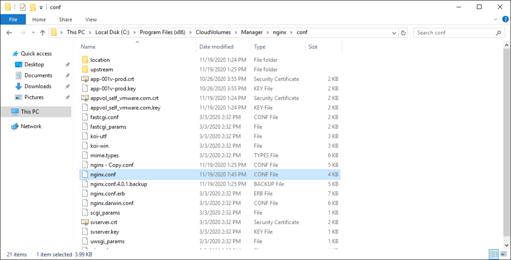 Directory to nginx.conf configuration file: C:\Program Files (x86)\CloudVolumes\Manager\nginx\conf — Make a copy before editing!