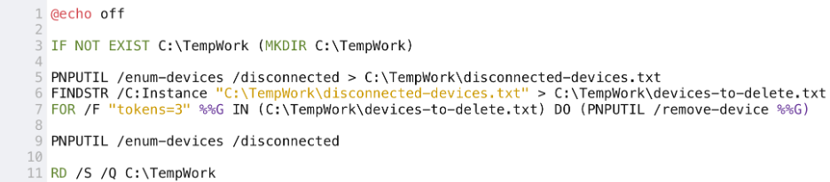 @echo off IF NOT EXIST C:\TempWork (MKDIR C:\TempWork) PNPUTIL /enum-devices /disconnected > C:\TempWork\disconnected-devices.txt FINDSTR /C:Instance "C:\TempWork\disconnected-devices.txt" > C:\TempWork\devices-to-delete.txt FOR /F "tokens=3" %%G IN (C:\TempWork\devices-to-delete.txt) DO (PNPUTIL /remove-device %%G) PNPUTIL /enum-devices /disconnected RD /S /Q C:\TempWork