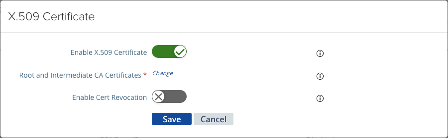 Enable X.509 Certificate by sliding the toggle to enable. Add all intermediate and root certificates that signed the user smart card or PIV tokens in the Root and Intermediate CA Certificates section.