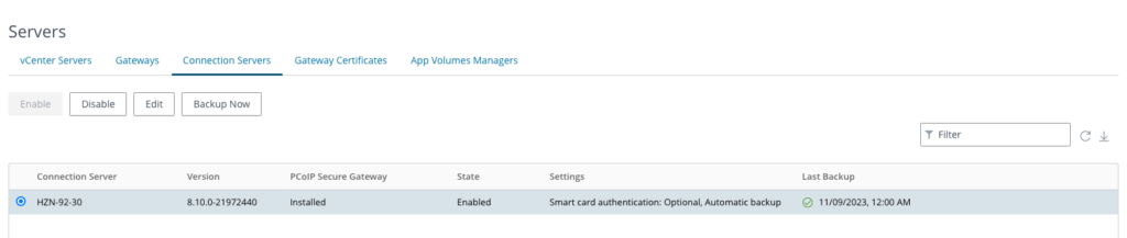 In Horizon Console, navigate to Settings > Servers > Connection Servers. Choose a Connection Server from the list and select Edit.