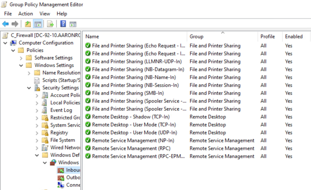 I choose to use the Windows Defender Firewall with Advanced Security and configure it’s use with Group Policy. A few things I configure are basic, like allowing Windows Remote administration (Remote Service Management), Remote Desktop services, and ICMP (File and Printer Sharing).