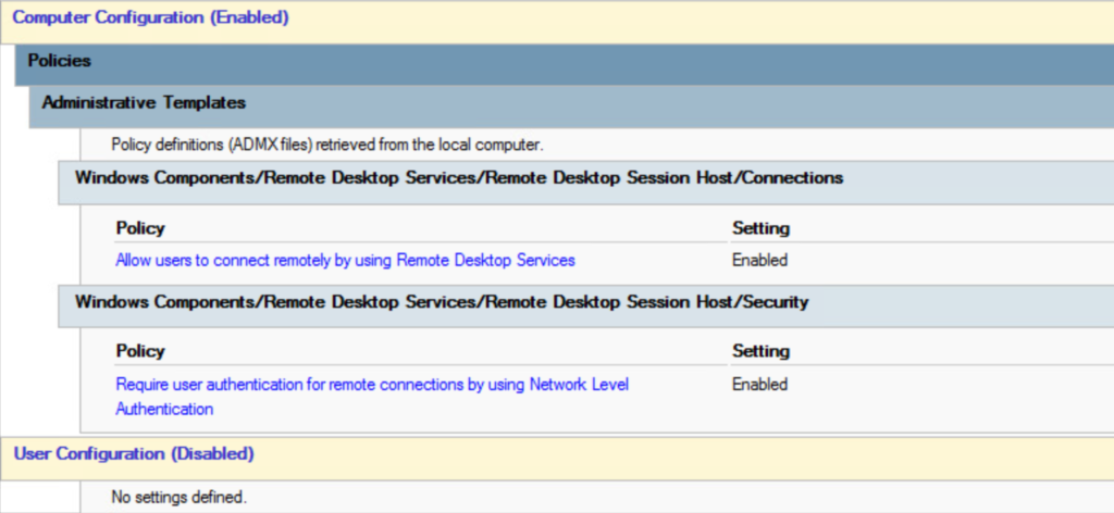 Minimally, I configure Remote Desktop Services be enabled and require Network Level Authentication (NLA). Same as above, don’t forget to apply the policy to the correct OU.