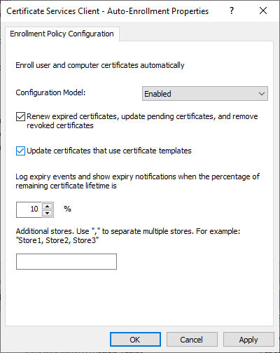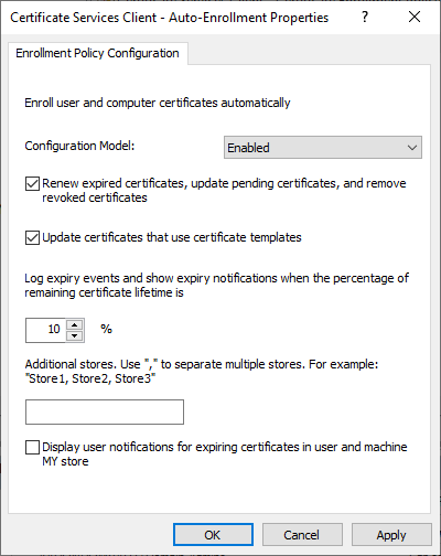 Computer Configuration > Policies > Windows Settings > Security Settings > Public Key Policies > Certificate Services Client – Auto-Enrollment (Enabled)