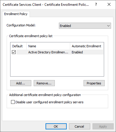 Computer Configuration > Policies > Windows Settings > Security Settings > Public Key Policies > Certificate Services Client – Certificate Enrollment Policy (Enabled)