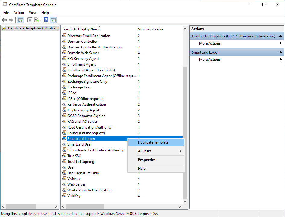 Click Certificate Templates, locate and right-click Smartcard Logon, and select Duplicate Template.