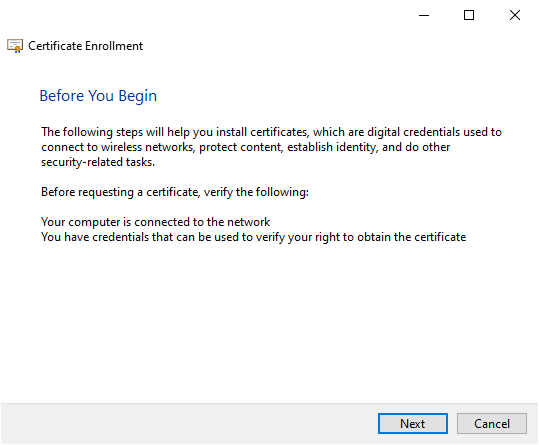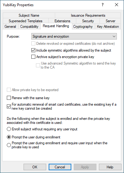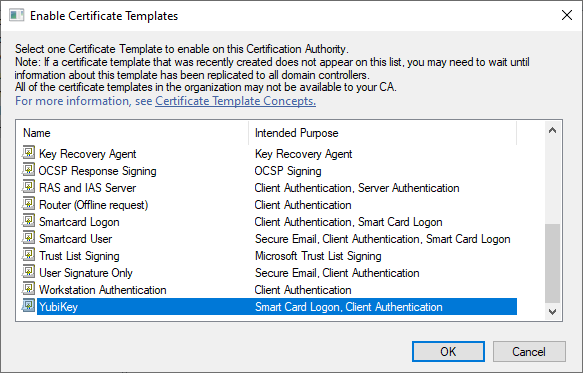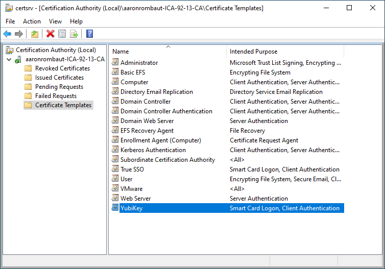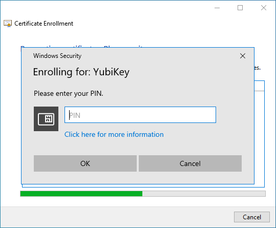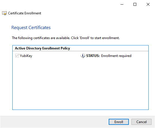 I opted for User Self-Enrollment as I was only concerned with getting certificates on my YubiKey. In an Enterprise or larger organization, I think Enrolling on behalf of others would be more appropriate. Dedicated staff, either IT or HR (preferably both) should be involved in the process. At the Enterprise level, Smart Card authentication is more of a policy issue (how do we do this) than a can we do this issue.